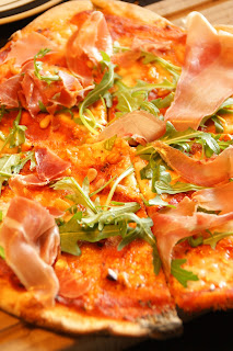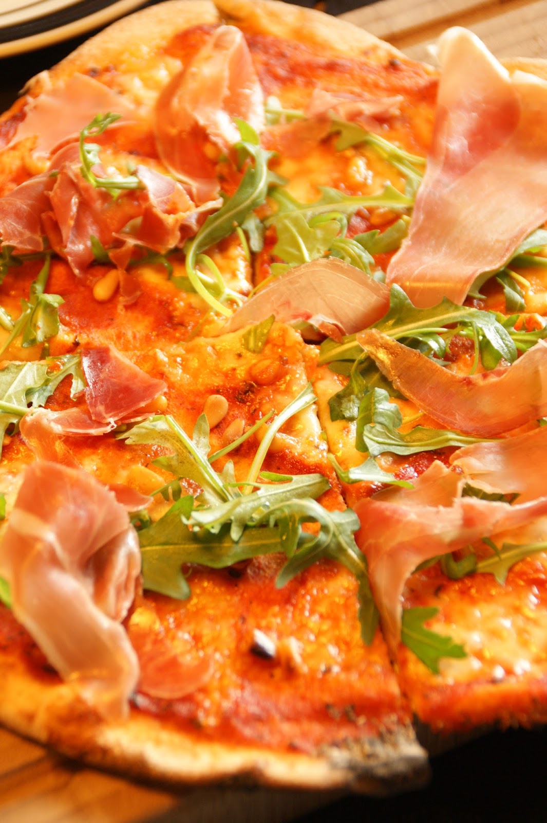 Da pizzaen kom ud tilføjede vi italiensk skinke og frisk rucola salat.