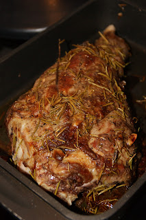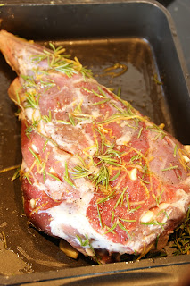 Lammekøllen blev smurt med krydderurter, olie og hvidløg og kom i stenovnen mens temperaturen stadig var høj (200 grader) så den kunne blive brunet. Dernæst tildækket med alufolie indtil den var dejlig mør.